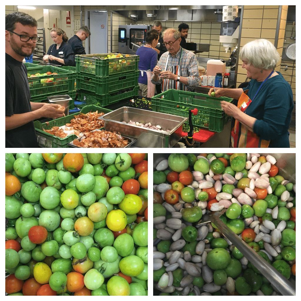 „Letzten Sonntagmorgen trafen wir uns (Rafi, Silvie, Oliver, Erna, Willy und Saskia, Franziska) um 10 Uhr vor der Blauen Ente, erwartet von Alex und Carlo, den beiden Köchen und Kursleitern. Ja, sie waren unsere Kursleiter, denn wir haben viel gelernt und erfahren! Zuerst mussten alle von den Genossenschafter:innen gesammelten Gläser gereinigt werden – eine Riesenarbeit. Ein paar von uns stachen den Tomaten das Bütschgi aus, auch dies viel Arbeit, die fast bis Mittag dauerte. Wir haben Knoblauch und Schalotten geschält und konnten staunend zuschauen, wie Alex Thymian und Zwiebeln hackte. Die Tomaten wurden in riesigen Kübelgefässen über eine Stunde lang gekocht. Nur wenige kleine grüne Tomaten kamen zum Schluss noch ganz unter die Chuttneymasse.