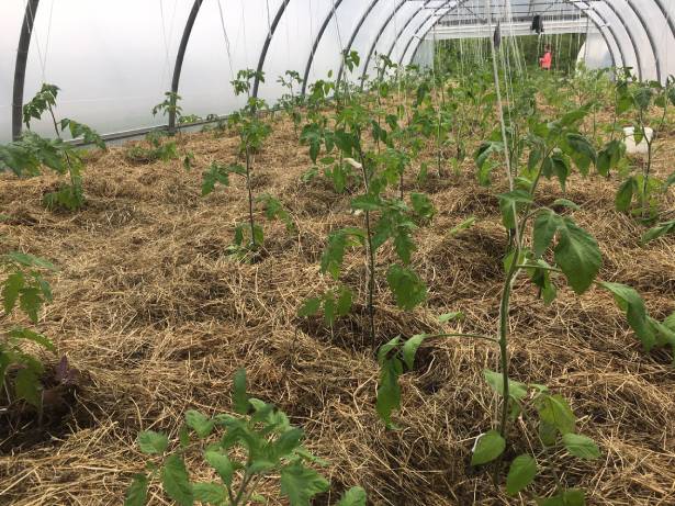 Im März und April wurden unsere zwei Tunnels in der PUK gedeckt, sowie die Rollfronten installiert, die man zum Lüften bequem hochrollen kann. Wir haben danach sogleich den Boden bearbeitet: Zuerst rund 30 Schubkarren Kompost verteilt, danach mit der Grabegabel tief gelockert, bewässert, Dünger ausgebracht und dann gefräst, damit die Tomaten in gut gelockerten Boden gesetzt werden können. Ende April haben wir zudem eine Schicht Silage ausgebracht: Diese sollte den Boden vor Trockenheit und Licht schützen, feucht halten und wenn möglich von unten her verrotten, damit im Herbst dann nicht mehr viel davon übrig ist und wir dafür einen gesunden Bodenaufbau (Aktivierung des Bodenlebens) fördern. Nun werden wir bereits anfangs Mai die rund 10 Sorten/220Stück Tomaten pflanzen, die schon ziemlich gross gewachsen bereit stehen -> wir haben sie seit Februar im warmen Teil der Gewächshäuser der PUK grossgezogen. Dabei hoffen wir, dass die Temperaturen nun nicht mehr viel unter 10°Grad fallen und sie gut in den Tunnels loswachsen können.