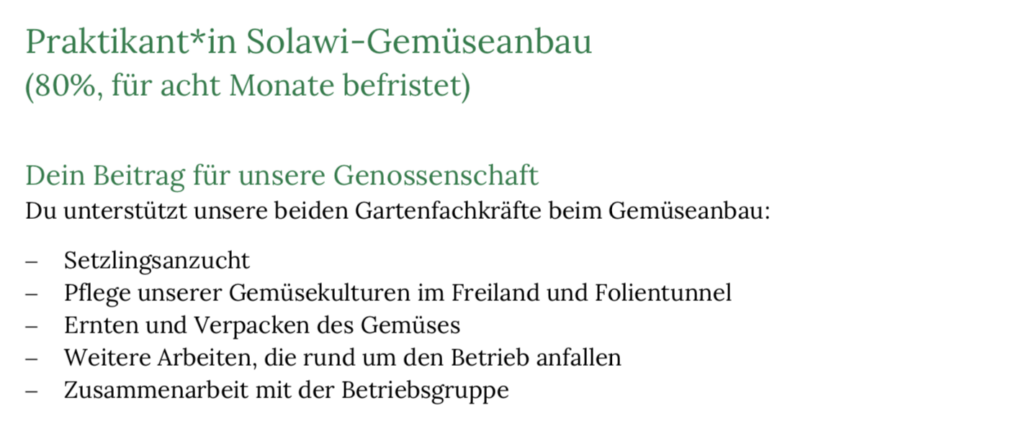Praktikant*in gesucht! 15. November 2021 von Claudia Keller Für die kommende Saison und unseren Ausbau auf der Wynegg suchen wir Verstärkung für unsere beiden Gartenfachkräfte. Bewerbungen sind ab sofort bis zum 1. Dezember willkommen! Mehr Informationen zum Praktikum findest Du hier: